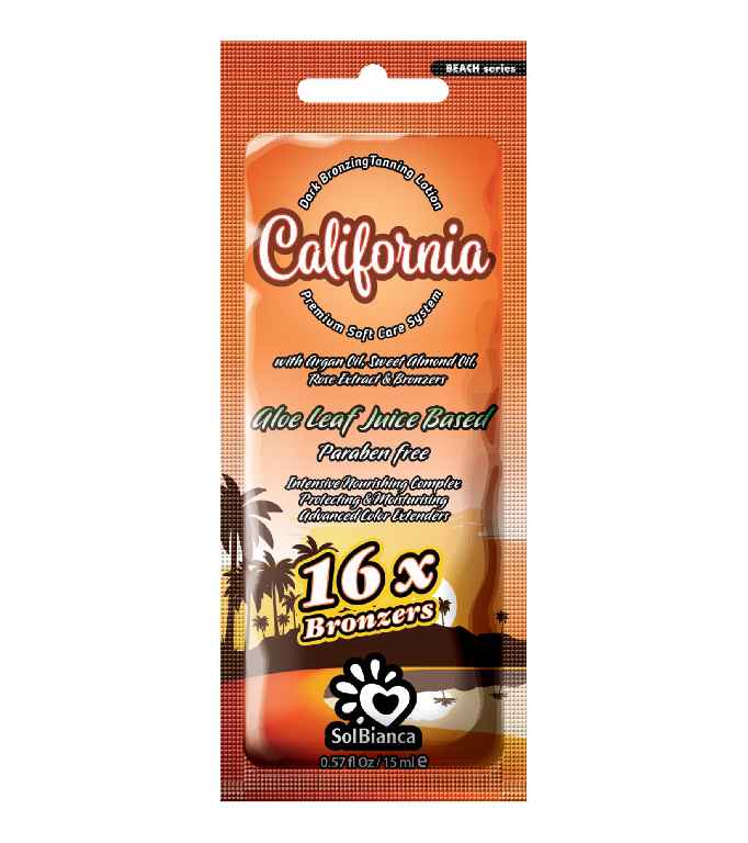 California - 16x Bronzers, 15 мл - крем для загара состоящий из 16 - компонентного бронзатора, стимулирует проявление насыщенного оттенка, благодаря чему ваша кожа приобретет темный, стойкий и ровный загар без пятен и разводов. Крем содержит аргановое масло, которое интенсивно питает кожу. Масло сладкого миндаля и экстракт розы увлажняют кожу, способствуют ее смягчению, а также оказывают дополнительное питание. Пантенол обладает успокаивающими и восстанавливающими свойствами, обеспечивая дополнительную защиту. В основе крема содержится сок листьев алоэ, который способствует увлажняющими и смягчающими свойствами.