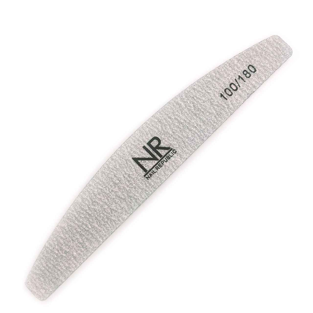 Полукруглая профессиональная пилка NAIL REPUBLIC для искусственных ногтей серого цвета. Сторона 100 грит используется для придания формы и подготовки у кутикулы в акриловой технологии наращивания ногтей. Последующая обработка поверхности производится стороной 180 грит.